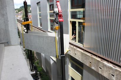 Räumlich bestanden die Herausforderungen unter anderem darin, dass die zwei Auflager an den zwei Gebäuden nicht genau gegenüber liegen und die Passerelle in der Horizontalen einen leichten Höhenunterschied bewältigen muss.