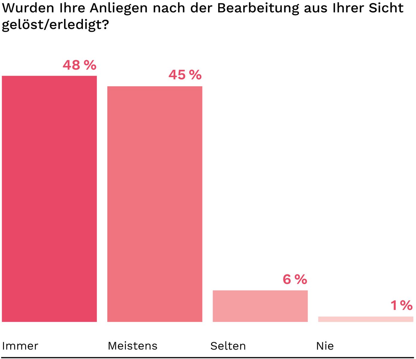 Auch bei der Bearbeitung von Anliegen zeigt sich ein positives Bild: Rund 90 Prozent geben an, dass ihre Anliegen immer oder meistens erledigt werden, und eine klare Mehrheit ist mit der Schnelligkeit der Bearbeitung zufrieden.