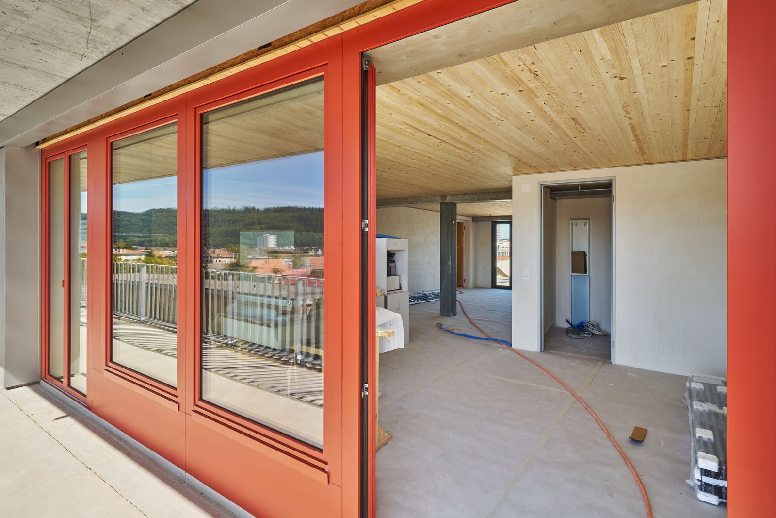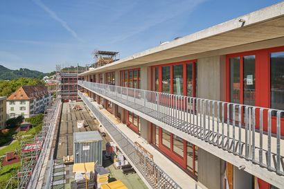 Baukonstruktiv besonders für ein Gebäude dieser Art, Nutzung und Grösse sind die mehrheitlich als Holz-Beton-Verbunddecken realisierten Geschossdecken. Vorteil dieser Konstruktion gegenüber konventionellen Stahlbetondecken ist nicht nur der Einsatz des nachwachsenden Rohstoffes Holz. Durch das deutlich geringere Eigengewicht der Decken kommt die Gebäudestatik insgesamt mit weniger Material aus. Darüber hinaus bleibt das Holz an den Deckenuntersichten sicht- und spürbar, dient als Feuchtepuffer und schafft ein gutes Raumklima sowie eine angenehme Raumakustik.