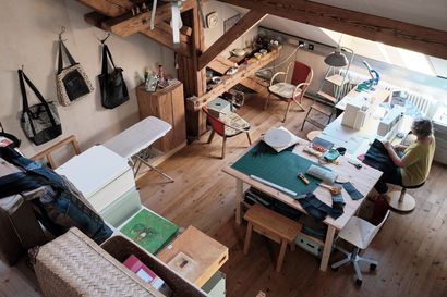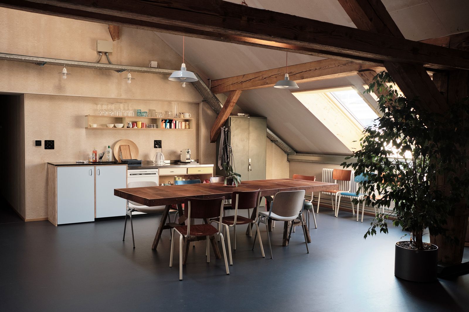 Die Atelierräume bestechen durch beeindruckende Raumhöhen, grosszügigen Tageslichteinfall über grosszügige Dachflächenfester und das Zusammenspiel von unterschiedlich alten wiederverwendeten Bauteilen und Materialien.
