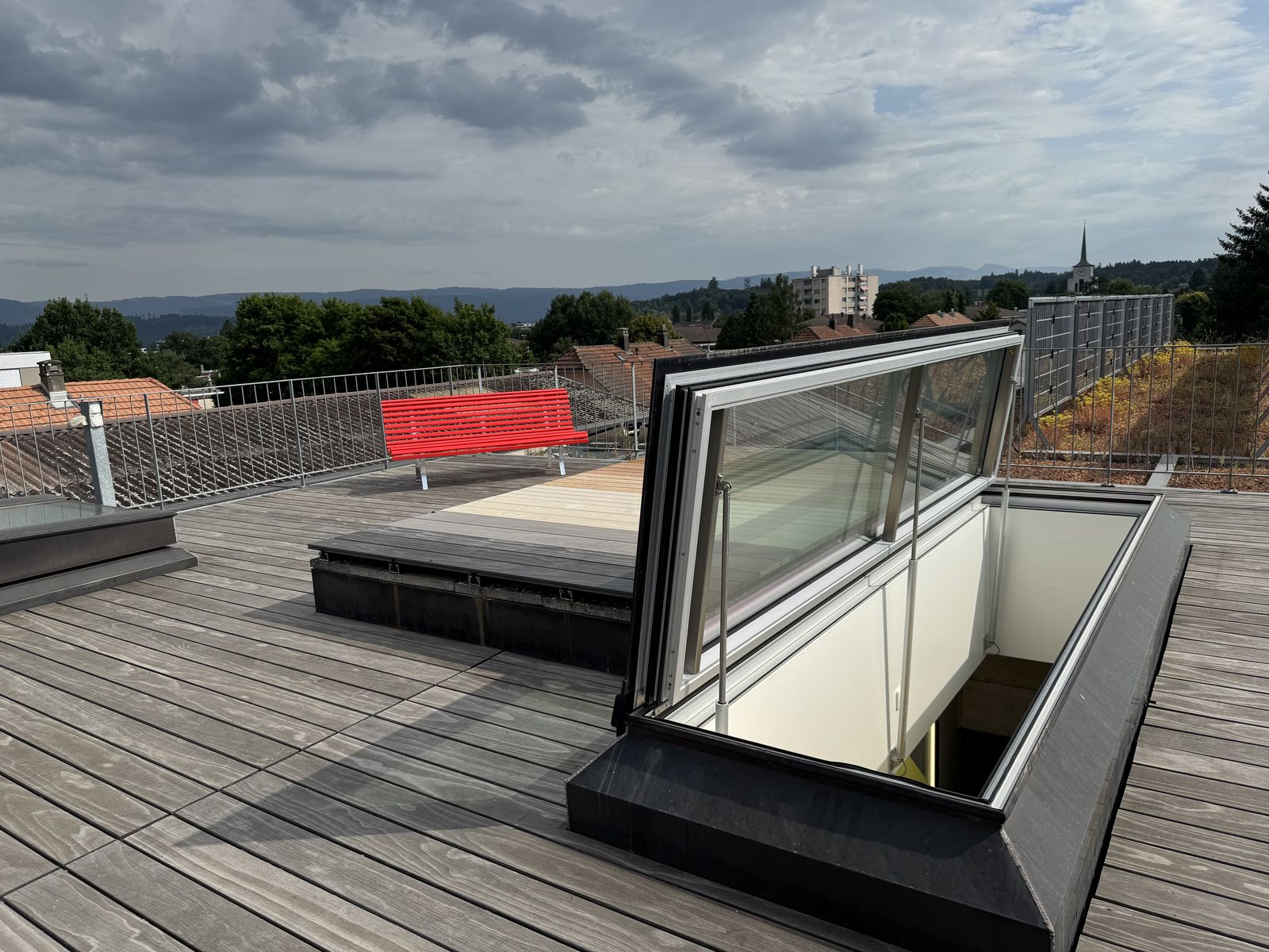 Depuis la terrasse sur le toit à Lyss, la vue s'étend à perte de vue – un endroit idéal pour le nouveau banc Abendrot, que nous avons livré juste à temps pour le 100e anniversaire de Felma. Il devient un lieu de rencontres, de discussions et d'idées, un havre de paix avec une vue imprenable pour tous ceux qui travaillent à l'avenir de l'entreprise.